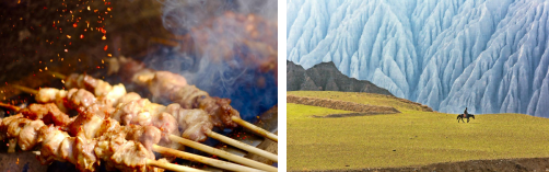 烤肉新疆维吾尔民间传统的串烤肉,同样既是街头的风味快餐,又是可以上席待客的美味佳肴。