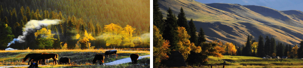 【行程安排】酒店早餐后,乘车前往【那拉提镇】。午餐后,前往游览【那拉提草原】(含门票+区间车),如果说春天是属于花的季节,那么秋天就是属于树的季节。秋天的树没有盛夏的暑气,也没有冬日的萧瑟,清凉的微风抚摸着树叶,温柔极了。山涧潺潺的河流带着秋的意境奔向远方,远处已有牧民开始打草,储备过冬之用。连阳光也散发着牧草的清香,也许正因为此,秋天的那拉提更让人怀念和期待,秋意像毡房里飘出的炊烟,在草地上、在树林里,构成了一幅秋韵绵绵的色彩斑谰的秋日那拉提……下午乘车返回【伊宁】,晚餐后,入住酒店。
