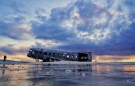 【DC-3 飞机残骸】位于冰岛南部Sólheimasandur 的黑沙滩上,成为冰岛最具标志性的景点之一。它与其 他自然景点不同的是,它是人类偶然性促成的一处景点,本身就具备历史性色彩。镂空的 DC-3 飞机残骸, 骨架钢框架和剥离的铝板一直受到海风的冲击,对于历史爱好者来说,就像在冰岛的荒野中寻找新奇点 一样迷人。DC-3 飞机残骸耸立在一片火山黑沙漠中任由海风的吹袭,这一景象简直太Cool 了,让人有种 星际大战的感觉。