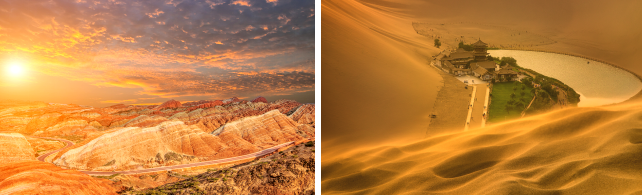 早餐后前往张掖参观游览【七彩丹霞】(含大门票+区间车,游览约 2.5 小时)600 万年前形成的奇特地貌,世界 10 大神奇地理奇观。曼妙的丹霞色彩如同大地调色板,浓烈地交织在一起,如波浪顺着山势起伏,在阳光的照射下,像披上了一层红色的轻纱,熠熠泛光,色彩异常艳丽,让人惊叹不已。同时,该地也是张艺谋导演《三枪拍案惊奇》电影的拍摄地。后乘车前往【金塔胡杨林】(含门票+区间车,游览约2小时)它位于甘肃省酒泉市金塔县城以西的潮湖林场,为三北防护林体系的一部分。那里有着上万亩人造胡杨林。周边分布大面积的沙枣树、白杨、红柳等大西北特有的树种,该胡杨林分布密集,长势良好,规模居全省之冠,极具旅游开发价值,不久的将来这里便会更加为人们所熟知。金秋十月的胡杨,绿色的树叶有的已经变黄,已经变黄的胡杨树,在湛蓝的天空下,在荒芜的沙漠中如阳光一般明媚灿烂。后入住嘉峪关酒店!
