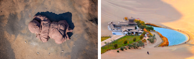 早餐后参观“天下第一雄关”【嘉峪关城楼】(含门票,不含区间车20/人,自愿消费,游览约1小时)嘉峪关关城是明代万里长城最西端起点,是长城防线上重要的军事要塞、河西第一隘口,也是古丝绸之路上的必经关隘,素有“天下第一雄关”之称。后乘车前往瓜州,带您掀开【大地之子】的面纱,在这里寻找你的初心。我们人类就像是地球母亲的孩子,只有在大地母亲的怀抱里才能够如此的安详,雕塑旨在唤醒人们对地球保护的重视。远观【海市蜃楼】它是由一个“主殿”和四个“阙楼”构成,名曰《无界》,在这戈壁荒漠中,实属一处难得的景致。中餐后乘车前往前往【鸣沙山月牙泉】(含门票,不含区间车20/人,骑骆驼100/人,自愿消费,游览约2小时)鸣沙山月牙泉位于敦煌市区以南,这里沙滩与泉水共存,是敦煌的名片之一。月牙泉位于鸣沙山下,处在沙丘环抱之中,因为地势的关系,刮风时沙子不往山下走,而是往山上流动,所以月牙泉永远不被沙子埋没,被誉为“沙漠之眼”。