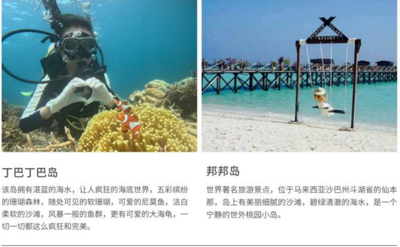 | 第3天 | 跳岛游:邦邦岛+丁巴丁巴+马达京 (含丁巴丁巴上岛费用) | 仙本那 TD 唐朝珍珠 /仙本那海丰大酒店 或 同级 | 包含 | 跳岛餐盒 | 敬请自理 |