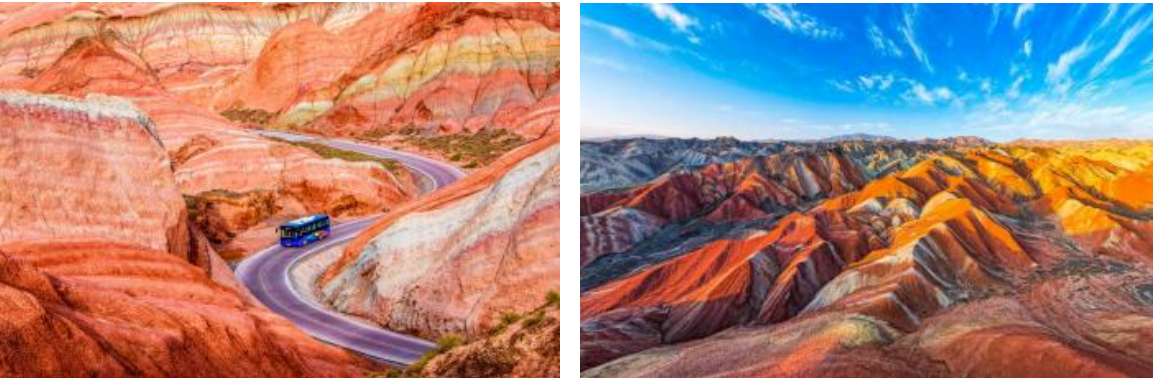 【丹霞地貌景区】(含大门票+区间车 ,游览约 2 小时) 600 万年前形成的奇特地貌 ,世界 10 大神奇地理奇观。曼 妙的丹霞色彩如同大地调色板 ,浓烈地交织在一起 ,如波浪顺着山势起伏 ,张扬而奔放地宣泄着古老的激情;