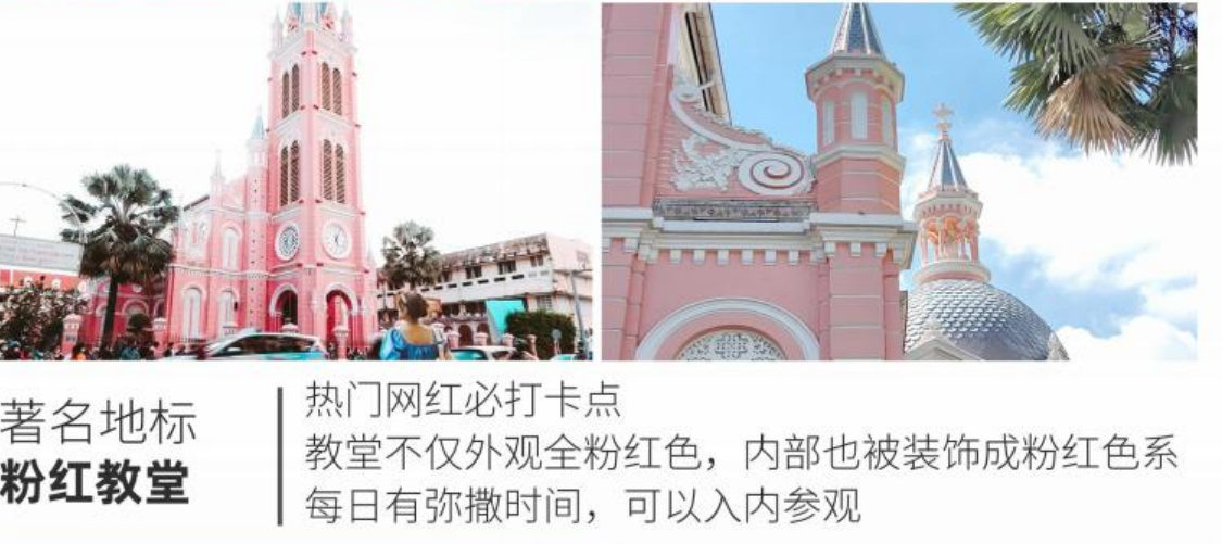抵达胡志明享用午餐 , 参观著名地标【粉红教堂】 外观(游览时间 15 分钟),新定教堂 , 又被称为粉红教堂 , 位于胡志明市第三区 ,建于 1876 年 ,粉紅色的外墙非常惹眼 ,据说是在 1957 年才漆上的。教堂不仅外观全粉红 色 , 内部也被装饰成粉红色系 , 每日有弥撒时间 , 可以入内参观 。不少人还会特地来此拍婚纱照 。之后参观【 百 年古邮局】 (游览时间 15 分钟) ,此建筑于 19 世纪末法人统治时代 ,属于重要的文化财产 。属哥德式建筑 , 室 内 不需装冷气 , 利用空气之流动 , 即让人感觉非常舒服了 , 内部半圆形的天花板极富古典气息 ,有集邮者也可