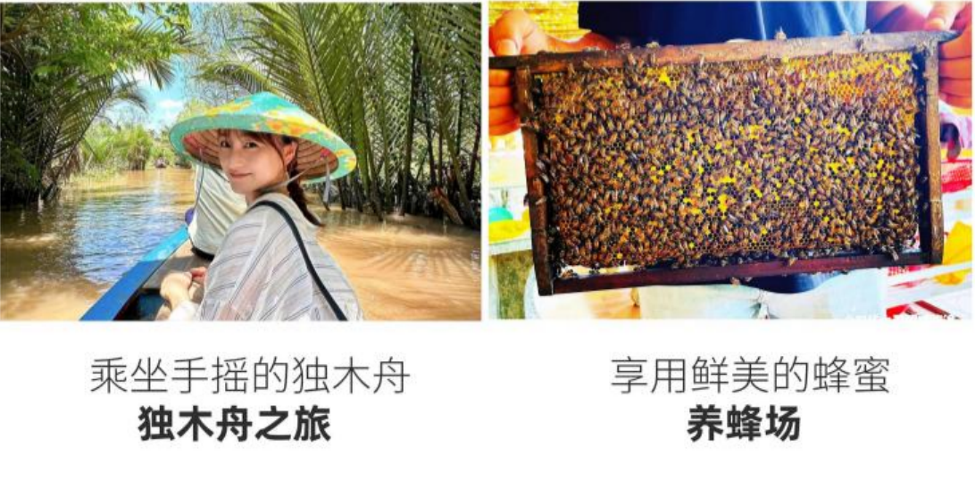酒店早餐后前往位于湄公河三角洲的美拖市(车程约 2 小时 ,行程停留2 小时) ,抵达后乘游船畅游【湄公河】 , 途中 前往河道中的【泰山岛】 ,泰山岛上出发 ,乘坐独木舟 ,船家一前一后划着桨 , 带您游览弯区交错的椰林小路 , 穿梭其间趣味无穷。于岛上享用果园内丰盛的热带水果餐 ,接着【坐马车】 逛槟知 ,观赏沿途的乡野 村庄 ,继而 【独木舟之旅】 ,参观当地的养蜂场 ,享用鲜美的蜂蜜。 午餐特别安排享用湄公河油泡象鱼风味餐 。 随后返回胡 志明市(车程约 2 小时) ,途中品尝一杯香甜的【滴滴壶咖啡】 (时间30 分钟) ,让您尽解一路上的 舟车劳顿!