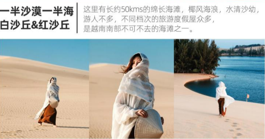 早餐后乘车前往著名的【白沙丘】 车程约 1 小时 ,方圆两公里左右 ,沙丘呈新月形 ,沙粒细腻 , 曲线曼妙 , 沙雾 随风起 。踩在松软的沙石上 ,起伏连绵。人像是要陷进去 ,实际上却能完全自如地掌控身体 。土路与沙丘之 间有 面湖 ,清澈而深邃。湖里长满了水草与荷花 ,衬得湖水清雅之极 ,触手便可捞起沙丘的倒影 。一旁 ,还有马 儿在