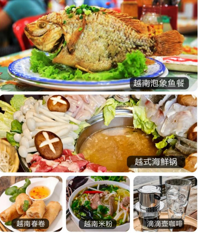 越南的主食是饭(米饭) ,但最著名的却是“粉 ”(音 fě) , 类似过桥米线,鸡汤或是牛肉汤。海鲜——来越南 最不能放过的就是海鲜了 。越南海岸线 3500 多公里,渔业发达,几乎任何一个沿海城市,都是重要的渔港。越 南海鲜很是好吃。