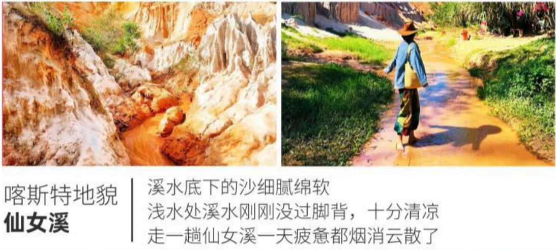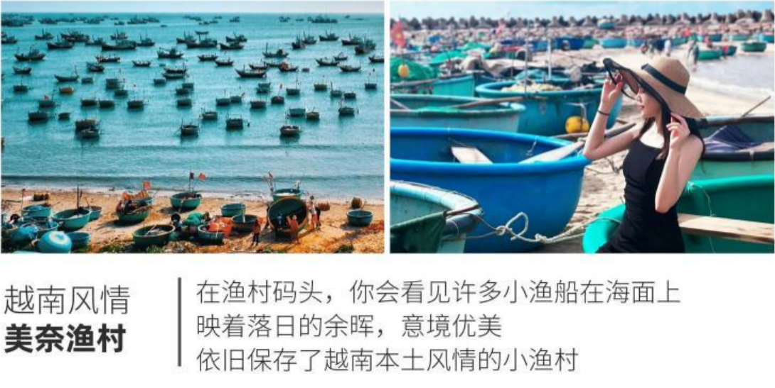 午餐前往参观【 Fairy stream仙女溪】 (游览时间约 1 小时) , 仙女溪是蜿蜒在红沙谷里的一条小溪,溪水 清澈,赤脚走在溪水里,浅浅的水花刚好没过脚踝,踩在水里的脚底可以感受到沙石的细腻和溪水的清凉 。 我们逆 流而上,在蓝天白云的映衬下,左岸红色的沙化山脊与右边成片的椰林稻田构成了一幅清新美丽的画卷 。 随后趁着 黄昏时分 , 前往美奈最具盛名的【渔村】 , 美奈的渔村是相当出名的 ,不信你看看Lonely Planet 的越南篇的封 面就用的黄昏的美奈渔村就可见一斑 。 只见静静的港湾密密麻麻的停满了渔归的小船 , 暖暖的落日将余晖铺洒 在 海面上 ,整个小渔港笼罩在一层淡淡的 、 暖暖的金纱里 。 晚上前往美奈海边 , 可以自选餐厅(自理) , 尝尝 当地 最新鲜的海鲜 , 丰俭由人 , 环境也十分优美 , 可以享受到迷人的海景和海风 , 让你在品尝美味的同时也可 以放松身心。
