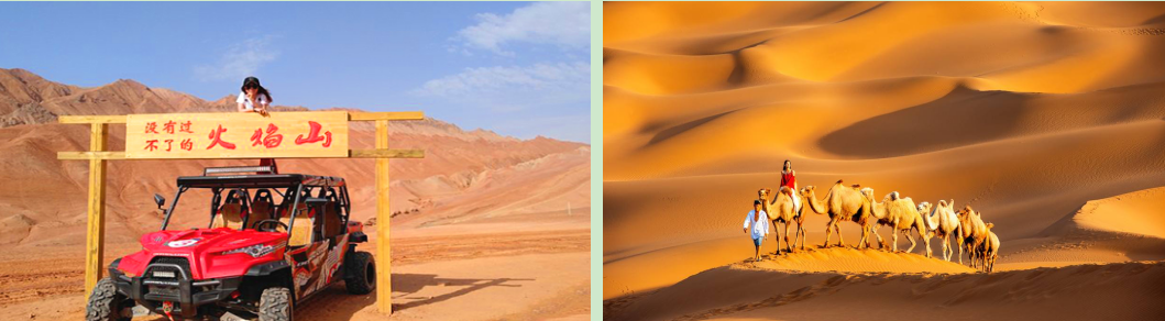 【行程安排】酒店早餐后,前往游览西游降魔之地【火焰山】(含门票),人说“人生没有过不去的火焰山”,凡到过新疆的人,一定会去看一看吐鲁番的火焰山。《山海经》中将其称之为“炎火之山”,维吾尔语叫“克孜尔塔克”,意为红山。每当盛夏,红日当空,赤褐色的山体在烈日照射下,砂岩灼灼闪光,炽热的气流翻滚上升,就像烈焰熊熊,火舌撩天,故又名火焰山。火焰山是中国最热的地方,夏季最高气温高达摄氏47.8度,地表最高温度高达摄氏89℃,在此体验“火洲”火辣辣的热情……乘车前往“哈密瓜的故乡”【鄯善县】,鄯善历史文化悠久,以汉古国名命名,是古丝绸之路上“四大文化”的交汇地。抵达后游览离城市最近的沙漠【库木塔格沙漠公园】(含门票+区间车),库木塔格在维吾尔语是“沙山”的意思,是塔克拉玛干沙漠的一部分,有“城中的沙漠”之称。库木塔格沙漠是是国内乃至世界罕见的与城市零距离的沙漠,沙漠与绿洲连成一片,创造了“沙不进、绿不退、人不迁”的奇迹。在这里,绿洲与黄沙相伴,飞鸟伴驼铃起舞,漫步在广袤的沙漠,彻底放松自己的身心……下午乘车返回【昌吉】,入住酒店。