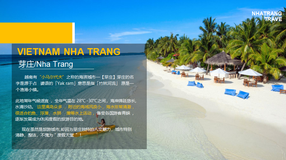 早上睡到自然醒 ,享用酒店丰盛的自助早餐后开启一天的芽庄经典打卡之旅。【芽庄 大教堂】芽庄大教堂 ,是一座哥特式教堂 ,建于1928~1933年.也很有法国味 ,教 堂有钟塔和美如锦花、绘满《圣经》故事的天窗玻璃 ,石头建造的内部墙壁给人清凉 之意。教堂外是繁杂吵嚷的街头 ,教堂内则静谧平和 ,俨然另一个世界。【占婆塔】 婆那加占婆塔建于公元7-12世纪间 ,是印度教的建筑。 占婆塔的建筑风格有些吴哥 窟的味道 ,但是规模小的多 ,雕刻也没有那么的细致。从位于小山上的占婆塔往下看, 能看到芽庄碧蓝的海港。中午特别安排品尝“越南三宝”越南河粉、春卷、法棍 ,越 南河粉是越南百年经典美食 ,是越南十大美食NO1的美食 ,越南河粉在东南亚菜系 , 乃至世界范围的粉面类食品中 ,都占有举足轻重的地位。【五指岩】五指岩 ,又称钟 屿石岬角 ,是芽庄少有的花岗岩海岸 ,也是跨国恋情电影《情人》的主要拍摄地。这 里自然风景与人文风景相结合 ,是海岛风光和乡土风情相结合的寺内的汉字门联、龙 纹雕柱等元素都透露着强烈的中国文化气息。龙山寺的吸引人之处在于其后山的白色大佛。爬上后山的150级台阶 ,就会来到这24米高的大佛前 ,这里可以俯视 芽庄的城市美景。