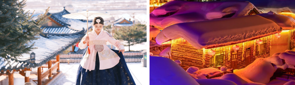 【活动安排】酒店早餐后,乘车前往【中国朝鲜族第一村】(赠送景点,不参观无费用可退),观朝鲜族古建筑非物质文化遗产博物馆,了解中国朝鲜族历史,体验朝鲜族浓郁的民俗文化。参观辣白菜,打糕博物馆,了解朝鲜族饮食文化。参观朝鲜族人家,了解朝鲜族生活起居文化,体验朝鲜族民风民俗,学习朝鲜族日常用语……乘车前往【中国雪乡】(含二次倒站车)。每年的10月底至次年5月积雪连绵,年平均积雪厚度达2米,雪量堪称中国之最,且雪质好,粘度高,素有“中国雪乡”的美誉……走在【雪韵大街】上,人来人往、热闹非凡,街两旁的店铺热情迎客。偶有一个狗拉雪橇呼啸而过,还有三三两两的孩子拉着爬犁在雪中前行。赏雪、戏雪、拍摄雪景……晚餐后,还可参加【雪韵大街扭秧歌】、【花车巡游】、【篝火晚会】(此项目为雪乡林业局统一安排,如无法安排,不退任何费用)……更可【穿花袄】裹上红绿相间的碎花棉袄,扎起两条麻花辫,瞬间化身“屯里人”,在雪堆前、灯笼下摆个姿势,拍一组充满东北味儿的大片,俏皮又喜庆….. 入住雪乡景区内特色东北大炕,一进院门,便能感受到浓郁的东北文化氛围,满院子厚厚的积雪,大红灯笼高高挂,屋子里暧暧的!